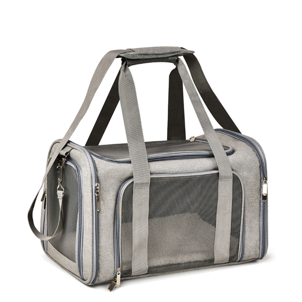 Bem ventilada e arejada, possui abertura nos dois lados, o pet pode entrar de um lado e sair do outro lado, e também abertura em cima e na parte da frente. Possui alça na parte de trás que encaixa perfeitamente com as alças da mala do dono podendo carregar tudo junto, dispõe de fechos de metais resistentes e é uma bolsa dobrável e prática de guardar. Tem bolso na lateral e engate para coleira na parte interna. Acompanha alça longa regulável e confortável. Bolsa de transporte pet flexível e com medidas próximas e aceitas pela maioria das companhias aéreas.